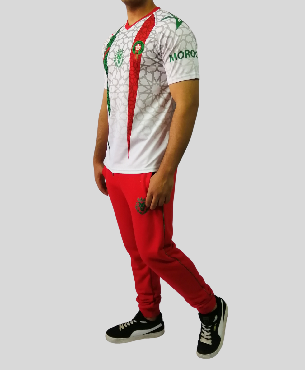 • Symboles forts : carte du Maroc avec étoile verte, écusson circulaire avec couronne et texte arabe, inscriptions « MOR » et calligraphie sur les manches.